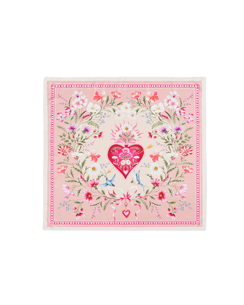 Let your style bloom with our Penelope Story Pink Square Scarf. Crafted in silky, lightweight fabric, it is adorned with a flourishing wreath of colourful flowers, delicate bows, and hearts - whimsical details that evoke the charm of a garden in full bloom. Feminine, playful, and full of charm, this scarf adds a tender flourish to any outfit.