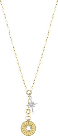 Rooted in the charm traditions of 17th-century Brazil, where symbols were worn to mark life’s passages and hold wishes for the future, this necklace becomes part of your path, worn close and lived with meaning. Diamonds and brushed detailing enhance the magic of the celestial charms.