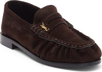 Tiny, gleaming YSL-monogram hardware accents the keeper strap of this timeless penny loafer made in Italy from calfskin suede with a gathered apron toe.