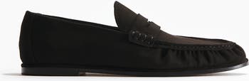 Loafers with a soft napped finish featuring a penny strap and moccasin seam at the front. Twill linings and soles that are patterned underneath.