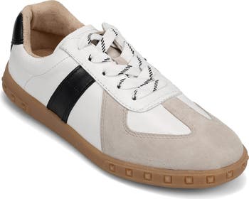 A sleek combination of suede and leather lends textural intrigue to a low-top sneaker that's both posh and practical.