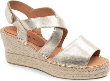 Metallic leather straps add a flash of glamour to a lofty wedge sandal crafted in Spain with espadrille-inspired trim and a cushioned footbed.