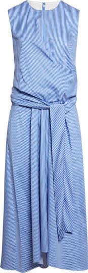 Crisp stripes add to the overall sunny-day charm of this sleeveless silk dress styled with a waist-accentuating attached tie and a fluttery hem.