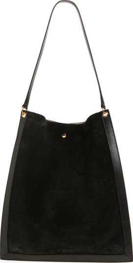 This sleek north/south tote bag is crafted in Italy from supple suede and bound along the edges with smooth leather for a polished finish.