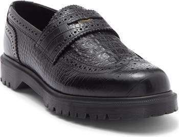 This handsome penny loafer is crafted from heavyweight Analine Croc Emboss leather and has brogue detailing across the upper for a look both classic and long-lasting. It offers signature comfort with Doc Marten's AirWair cushioning and a flexible traction sole.
