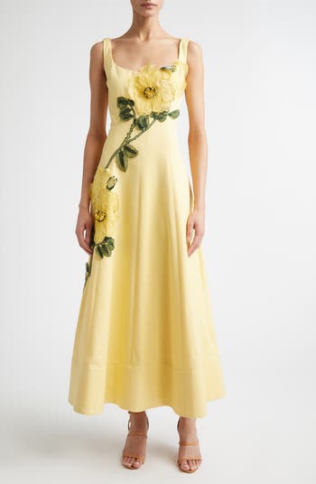 Exquisitely embroidered, sheer organza peonies cascade down the side of this long fit-and-flare dress cut from cotton-blend sateen enhanced with a touch of stretch.