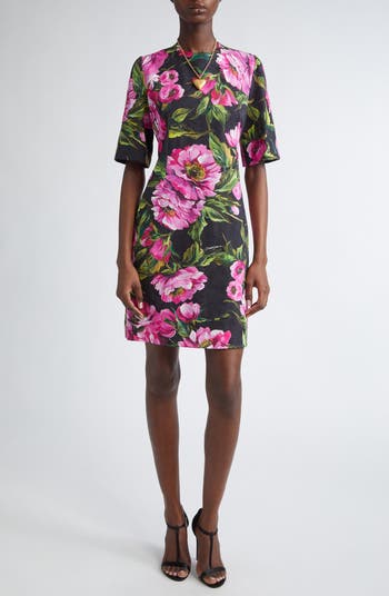 The Italian fashion house's perennial nature fascination inspires a lavish peony garden on this stretch-cotton sheath dress lined with silky crêpe de Chine.