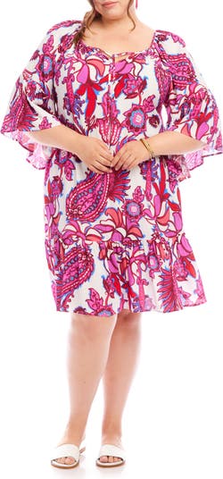Vibrant blooms and ruffled accents dreamily define a lightweight dress perfected with a pair of pockets.