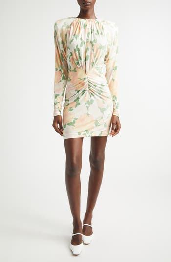 Fluidity and structure come together seamlessly in this jersey minidress designed to transition easily from day to night. The peony print brings a spring awakening to the drama of the silhouette that ripples with dimensional ruching that's balanced by the padded shoulders.