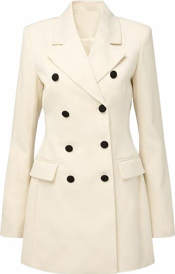 - Inspired by a double-breasted blazer, this tailored mini dress comes in wool suiting, structured with princess seams and set off with contrast buttons. It has classic tailored finishes, including notched lapels, flap pockets and a peplum waist. Peplum shaped waist Mini length dress Notch collar Double breasted Contrast color center front buttons Princess seams Flap pockets 73% Polyester 25% Wool 2% Spandex Machine wash with like colors. Do not bleach. Hang to dry. Iron warm.