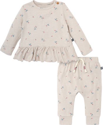 This baby girl peplum top and pant set blends everyday comfort with delicate, feminine charm. Made from exceptionally soft hacci fabric, it’s gentle on sensitive skin and designed for all-day wear. The flared peplum hem adds a sweet, playful shape, while the stretchy waistband and cinched ankles keep the fit flexible and secure. In a soft marbled blush hue with a subtle flower print, this cozy set is perfect for everything from playdates to picture moments. Our essentials have been independently certified with STANDARD 100 by OEKO-TEX® so that you don’t have to worry about harmful substances in your little one's wardrobe. Pack includes matching peplum top and pants set from modern moments™ by Gerber®®.