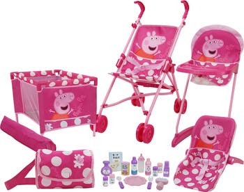 PEPPA PIG: 21 PIECE DOLL PLAY SET - PINK & WHITE DOTS - Peppa Pig Baby Doll 21 Piece Combo Play Set is the ultimate role play set, which includes a very cut Doll Stroller, a Doll Play Yard with carry bag, a Doll Highchair, a Doll Car Seat, and a Diaper bag / handbag plus 15 piece Grooming and Feeding accessories, all featuring the very cute Peppa Pig design. For little parents to play with their favorite dolls or plush characters in many different play options. The Doll Stroller includes harness belt to keep the little mommy's favorite doll secure. This stroller can be compact folded for easy storage. The Doll Play Yard is for sleeping and storage, easy to assemble and carry bag is included. The metal frame Doll Highchair with feeding tray and full plastic Doll Car Seat, together with 15-piece doll grooming and feeding accessories provide full nurturing care to the baby doll. . The diaper/handbag is a great additional piece to the set and allows little parents to carry the accessories on the go. This all-in-one play set will bring endless amount of fun and fantasy play for little parents around the Globe! INCLUDES: Doll Play Yard, Highchair, Stroller, Car Seat, Feeding Accessories & Handbag. PRODUCT DIMENSIONS: Stroller Size (L x W x H) : 47 x 27.5 x 54.5cm / 18.5" x 10.8" x 21.5". Play Yard Size (L x W x H): 43 x 27.5 x 28cm / 17" x 10.8" x 11". For dolls up to 18" (46 cm). *Doll Not Included*. Officially Licensed Peppa Pig doll accessory. Suitable for girls & boys ages 3 and up.