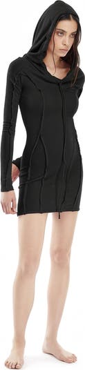 Sporty Mini Dress with Hood and Prominent Seams Add an edgy and contemporary touch to your wardrobe with this tight mini dress. The bodycon dress combines street wear elements with a flattering fit, presenting a unique design with prominent seams A tight and flattering mini cut that emphasizes the body's lines Includes a hood and long sleeves External seam details along the body and sleeves add a trendy touch to the look Mini length, perfect for pairing with boots or sneakers This dress is a statement piece that combines style with comfort, ideal for a casual-chic look.