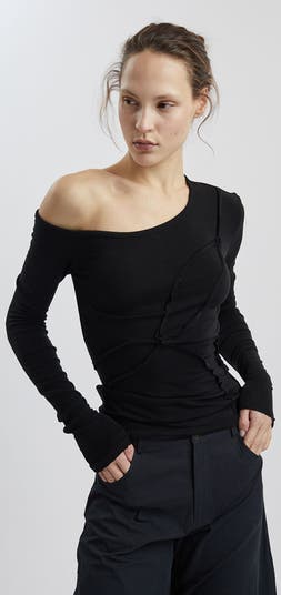 Asymmetric top with Prominent Seams Add a modern and bold touch to your wardrobe with this tight top. The top is designed with a unique asymmetric cut, featuring a long sleeve on one side and a bare shoulder on the other A tight and flattering cut that emphasizes the body's lines External seam details along the body add an edgy and contemporary touch to the look Made of stretchy and breathable fabric for maximum comfort This dress is a statement piece that combines elegance with casual style, ideal for an evening out or special events, with jeans, trousers or skirt.