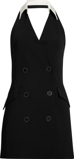 Bring a smart, preppy vibe to your look with this suit-inspired minidress styled with double-breasted buttons, point collar and flap pockets.