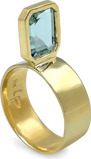 The label's signature perched setting holds an emerald-cut aquamarine that offers drama to a polished band of 14-karat gold.