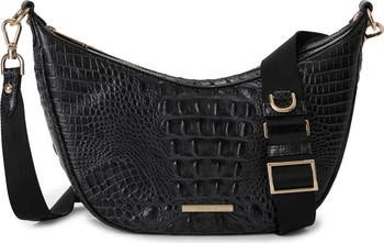 This everyday bag is made from croc-embossed leather in a clean, crescent shape and comes with a webbed strap that easily adjusts for shoulder or crossbody wear. A top zip secures your belongings, while a trio of interior pockets keeps them organized.