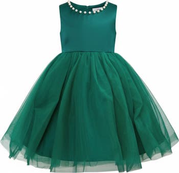 A show-stopping princess dress with a statement bow and pearl-trimmed neckline, perfect for Christmas, piano recitals, or special occasions.