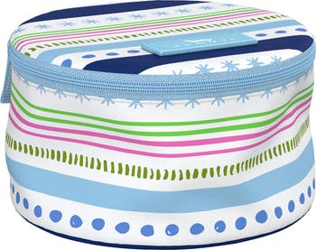 GEMS TO GO, NO TANGLES. Avoid tangles with this round compartmentalized jewelry case that is as cute as it is functional. There's a roomy main compartment, two drawstring pouches, and a lanyard in the lid (great for rings) that snaps shut. Pack it up, zip it shut, and go! A great gift too.