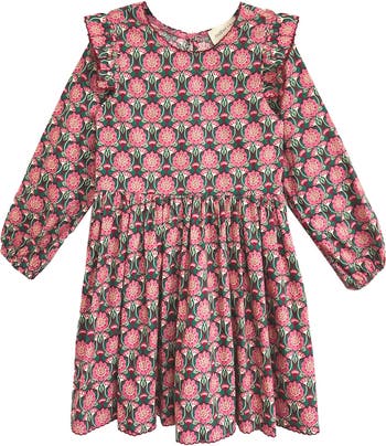 The Perfect in Pink Dress is designed to delight. It features a lively pink floral pattern set against a deep background, creating a timeless yet playful aesthetic. The gathered skirt gives it a twirl-ready charm, while the long sleeves with delicate gathers at the wrists ensure comfort and style. Ruffle details along the shoulders add a whimsical touch, making it a delightful choice for any occasion. Fabric Content & Care 100% COTTON Machine Wash Cold | Line Dry | Do Not Bleach