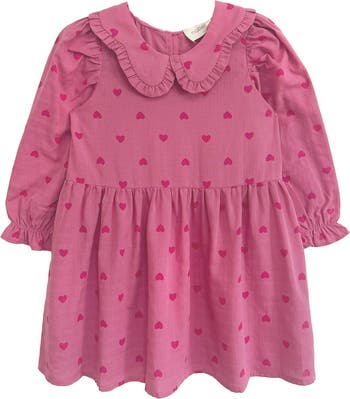 The Perfect in Pink Dress is a delightful addition to any little girl?s wardrobe. Its soft pink tone is beautifully complemented by a playful pattern of darker pink hearts, creating a cheerful look. Featuring a whimsical ruffled collar and matching ruffled cuffs on long sleeves, this dress combines elegance with fun. The gathered waist flows into a full, lightweight skirt, providing comfort and freedom for movement. Whether it?s a birthday party or a family outing, this dress brings style and grace to every occasion. Fabric Content & Care 70% COTTON 30% VISCOSE Machine Wash Cold | Line Dry | Do Not Bleach