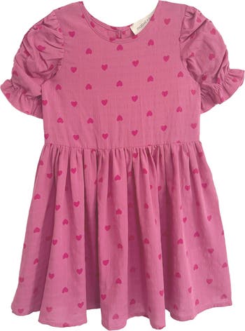 The Perfect in Pink Dress is a delightful blend of playful elegance and everyday comfort. Featuring a vibrant medium-pink hue adorned with pink heart patterns, this dress is sure to brighten up any occasion. The puffed sleeves and softly gathered skirt add a touch of style, while the lightweight fabric ensures all-day comfort. Whether she's spinning, playing, or making memories, this dress feels as lovely as it looks! Fabric Content & Care 70% COTTON 30% VISCOSE Machine Wash Cold | Line Dry | Do Not Bleach