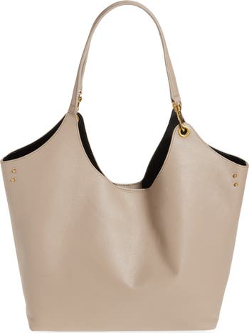 Polished hardware and a curved topline highlight the tumbled leather exterior of a spacious tote designed with multiple pockets and suspended from convertible shoulder straps for versatile carry.