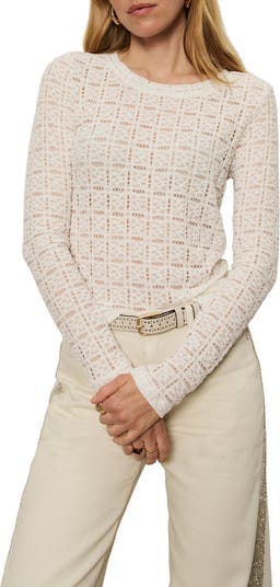 An airy pattern brings breezy style to this stretchy long-sleeve T-shirt made from puckered lace.