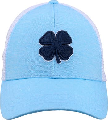 - • Versatile Sky Blue Hat with White Mesh for Breathability • 3D Navy Clover with White Trim • Memory-Fit™️, moisture-wicking headband for all-day comfort • Fitted Style