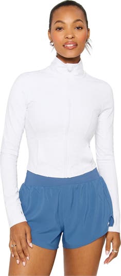 LEVEL UP. Don't miss on the design of the year. With sweat-wicking tech and 4-way stretch, this cropped jacket is essential for your workouts. You'll love the flattering fit, convenient thumbholes, and side pockets. Obviously, add to cart.