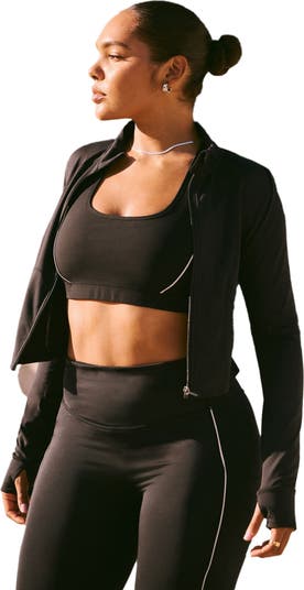 LEVEL UP. Don't miss on the design of the year. With sweat-wicking tech and 4-way stretch, this cropped jacket is essential for your workouts. You'll love the flattering fit, convenient thumbholes, and side pockets. Obviously, add to cart.