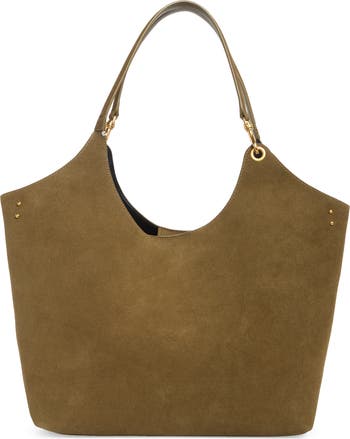 Polished hardware and a curved topline highlight the velvety suede exterior of a spacious tote designed with multiple pockets and suspended from convertible shoulder straps for versatile carry.