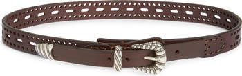 Perforations punctuate an Italian-crafted leather belt that's finished with decorative topstitching and ornately engraved hardware.