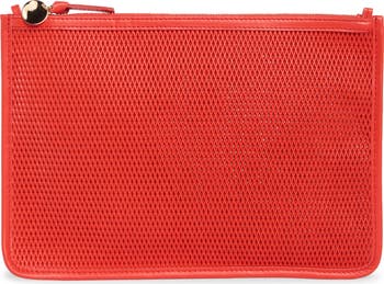 Intricate craftsmanship meets everyday utility on a flat, single-compartment clutch made from smooth perforated leather and detailed with polished goldtone hardware.