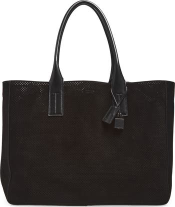 Crafted in Italy from supple perforated suede, this sleek tote designed for everyday use features an internal zip pocket and dedicated compartments for a laptop.