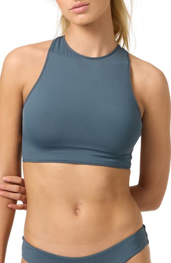 This high-neck bikini top is ready for a surf fay with a flirty back cutout and a stretchy performance fabric.