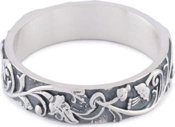A stackable band ring crafted from sterling silver is given dimension with an oxidized finish and an intricate weaving plant design.