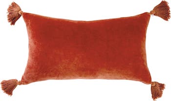 Plush tassels swing from the corners of an inviting accent pillow done in sumptuous auburn velvet.