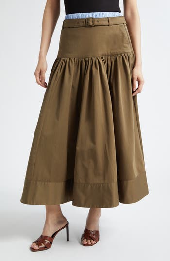 A touch of stretch enhances the comfort of an ankle-grazing maxi skirt fashioned with a mixed-media waist featuring an elastic band and matching belt.