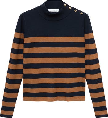 Gleaming golden buttons shine on the shoulder of this soft mock-neck sweater accented with eye-catching stripes.