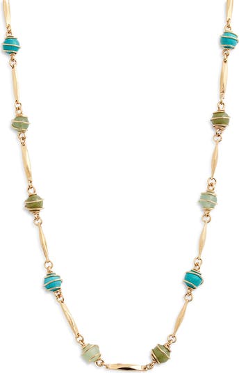 Gleaming baguette stations and wrapped semiprecious stone beads trace a stunning artisanal necklace handcrafted in France.
