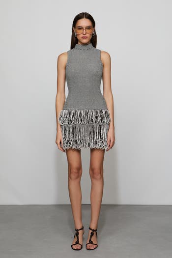 Knit mini dress with a marled texture and double-tiered fringe loops for maximum movement. Cocktail-ready energy.