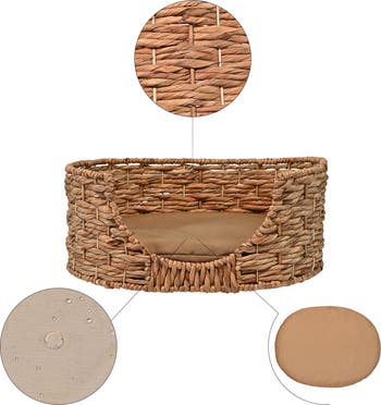This chic, natural wicker pet bed adds a classic farmhouse touch to any home. Made from eco-friendly hyacinth fibers woven onto a metal frame, and includes a washable cushion. The oval shape has high sides and is perfect for any small or medium-sized pet.