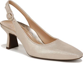 A statement heel at a walkable height completes the sleek silhouette of this slingback pump featuring technology that alleviates pressure to improve balance.