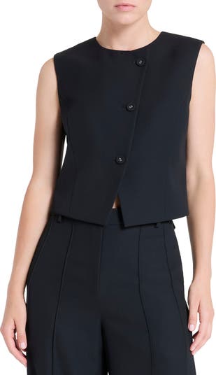 An off-center button placket strikes a modern mood for a trend-right vest cut from premium virgin wool.
