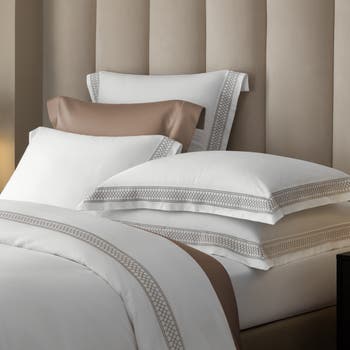 - The noble embroidery pattern decorating the pillowcases and duvet cover along the perimeter creates a radiant frame and emphasizes the immaculate white color