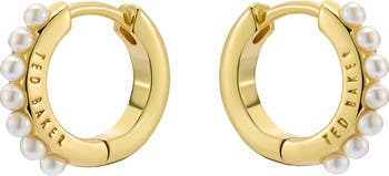 Lustrous faux pearls intensify the timeless sophistication of these gleaming goldtone huggie earrings.