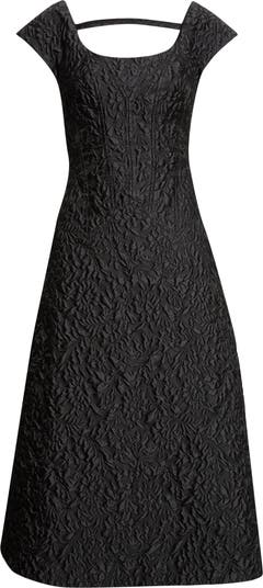 This fit-and-flare midi dress is crafted in a puckery floral jacquard woven with a touch of silk, lending subtle dimension to the clean, structured silhouette. A scooped neckline at the front is bisected by a slender strap, reshaping it into a bateau neck, while side-seam pockets add a practical touch.