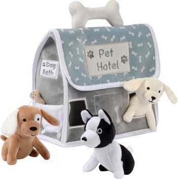 Welcome your child to a world of imaginative playtime with this fun filled Pet Hotel developmental plush playset. Comes complete with three adorable soft velour puppies. One is cream, one is light brown, and one is black and white. All the dog puppies have embroidered faces making them safe for all ages. The cleverly constructed Pet Hotel is made of taupe velour and the roof is teal velour with a white doggie bone print. The hotel is finished with EVA foam for stability, shape, and structure. The front of the roof is appliqued and embroidered with the name Pet Hotel. The roof opens and closes for great fine motor developmental play and also for keeping the puppies warm and cozy. There is a white velour bone-shaped carry handle, and two open windows for the puppies to peek out. On the side is a doggie bathtub with a hand shower that will keep the puppies clean and always happy. Children can have fun putting the puppies in and out of the numerous openings as they learn about object permanence. This soft developmental playset is where puppy dreams come true and tiny tails never stop wagging.