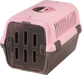 PET CARRIER II: MEDIUM - PINK - Richell’s Pet Travel Carrier is 100% made in the USA and designed to transport your pet safely from one location to another. With a comfortable handle and a clear plastic front door, this carrier is the perfect way to bring your pet along. It can be used as a pet house with the ability to take the door completely off. Featuring a seat belt latch to keep your pet safe and sound during car rides. This carrier is also fully collapsible for easy storage as well as 4 latches on the top and base for easy assembly. Because your pet is family, our Pet Travel Carriers are as comfortable for you as they are for your pet. Medium size for dogs and cats up to 17.6 lbs. Inside the carrier: (Medium) 13 x 20.7 x 12.8”H. Side door opening: (Medium) 11 x 11.6”.